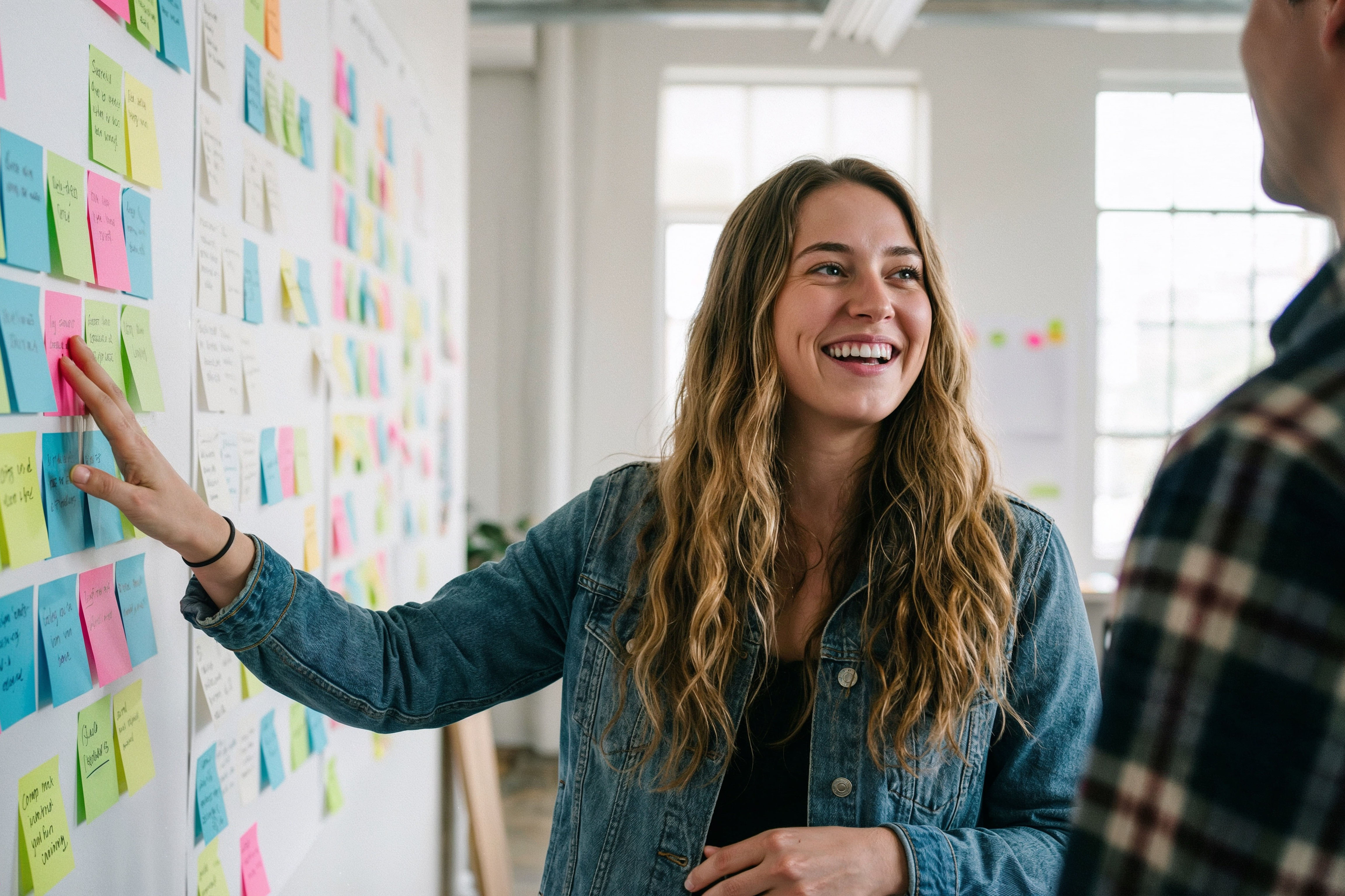 Jeune femme échangeant avec un jeune homme devant un mur à post it